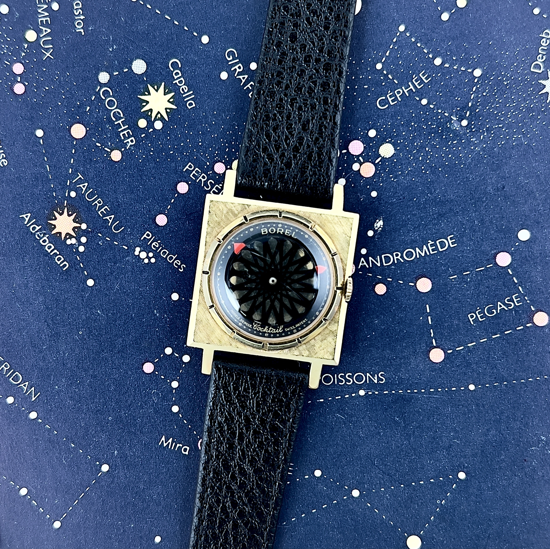 Très originale montre Ernest Borel datant des années 1960. Il s’agit d’un exemplaire de la célèbre série « Cocktail » de la marque.
