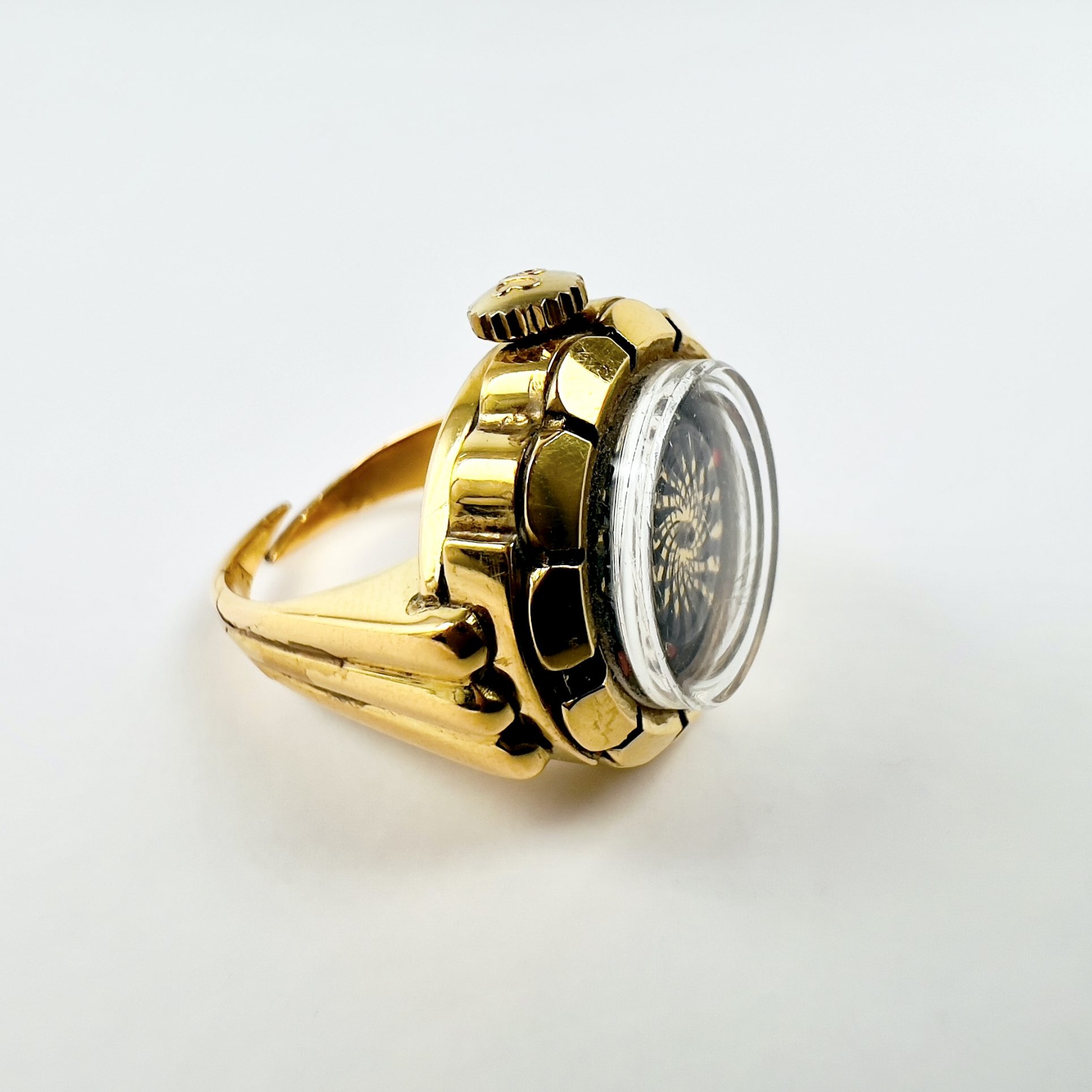 Le boîtier en plaqué or 20 microns présente une certaine patine proportionnelle à l’âge, mais rien qui n’enlève à la beauté générale. Le verre est quant à lui légèrement micro-rayé. La bague est estampillée des références 443169 et 166017U. Sa taille est d’environ 54 pour l’Europe, N pour UK et 7 pour USA.