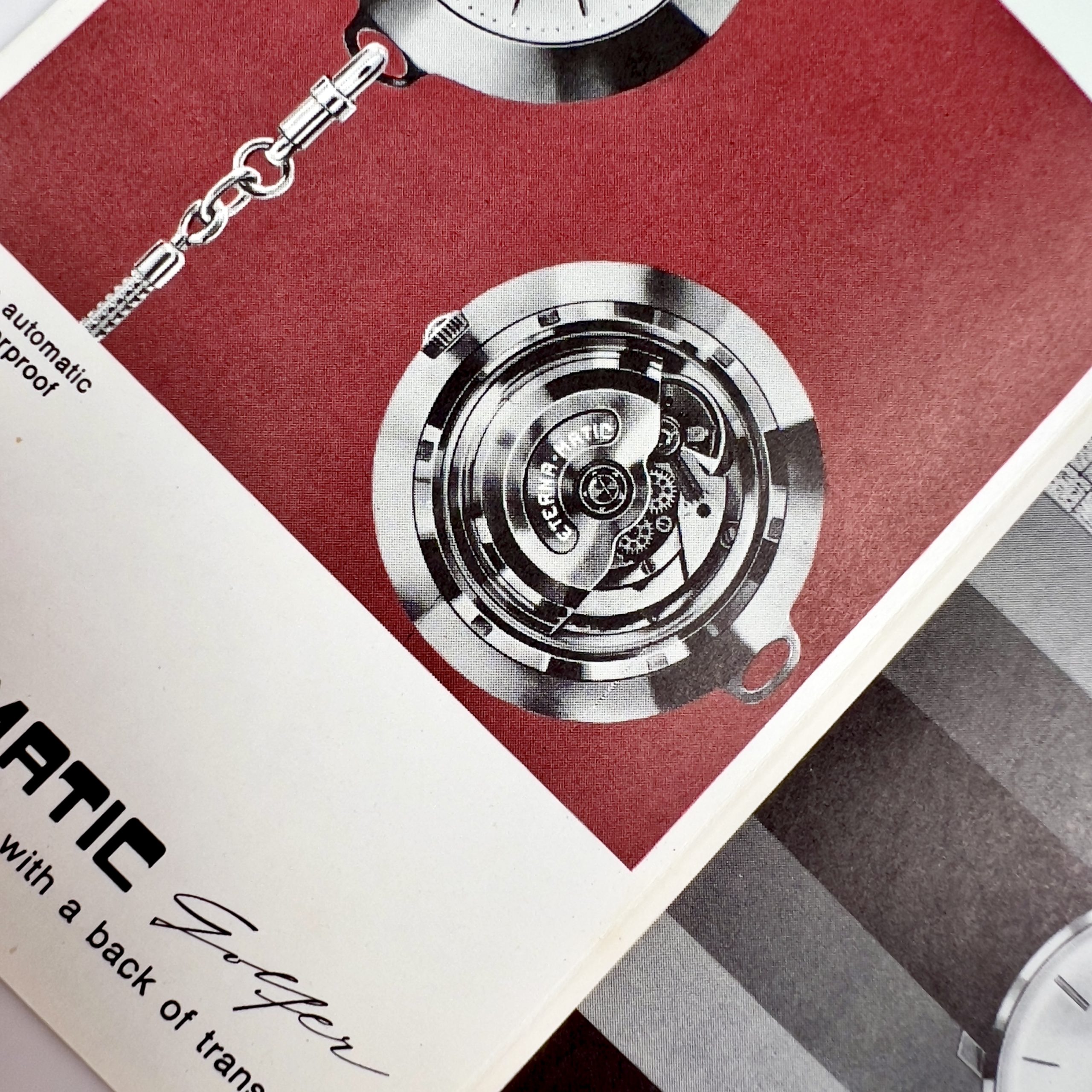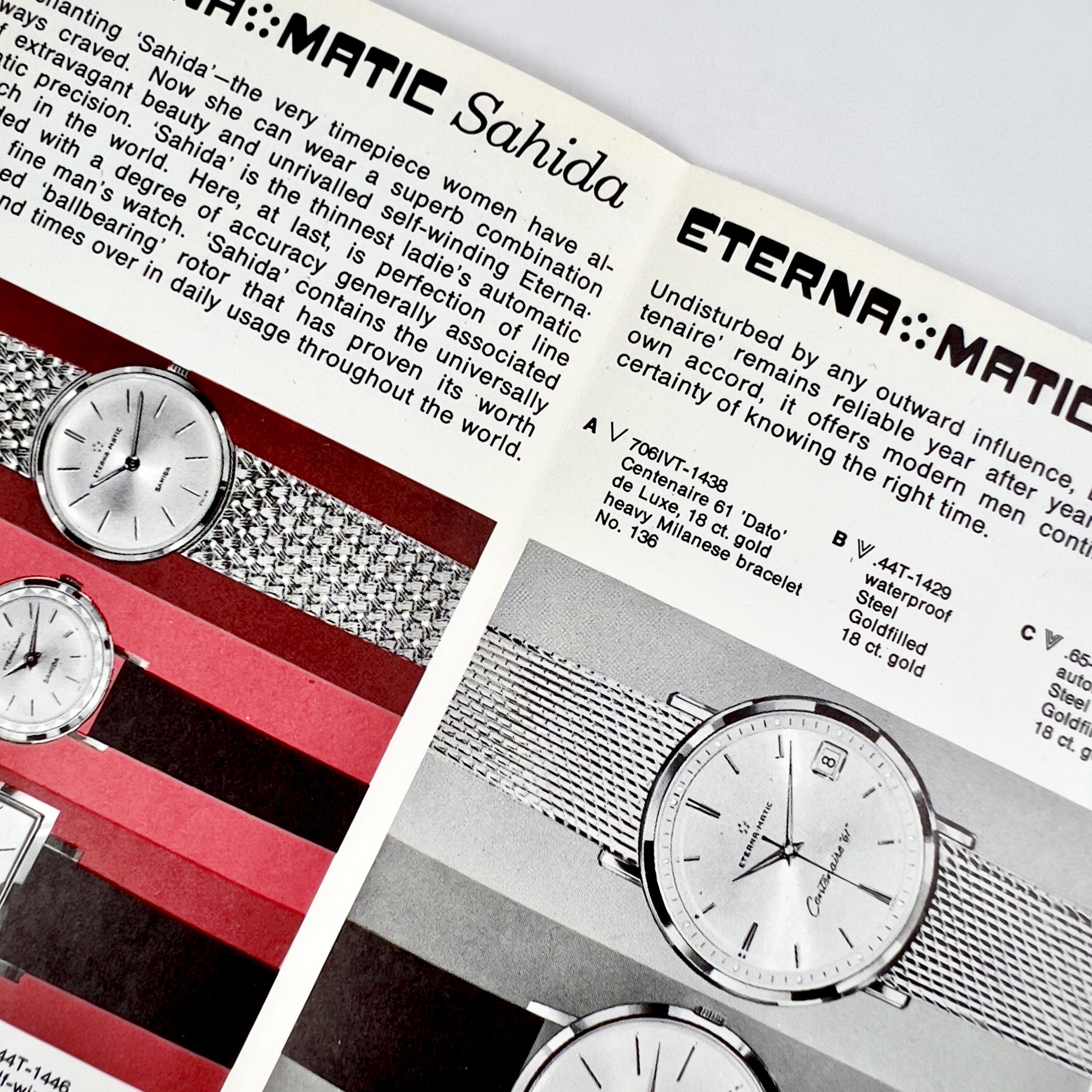 Ce petit catalogue est composé de 4 feuillets dépliants recto-verso présentant toutes les variantes Eterna-Matic, de la « Golfer », à la « Sahida », en passant par la « Centenaire », la « 3000 » ainsi que le « Kontiki ». Rare.