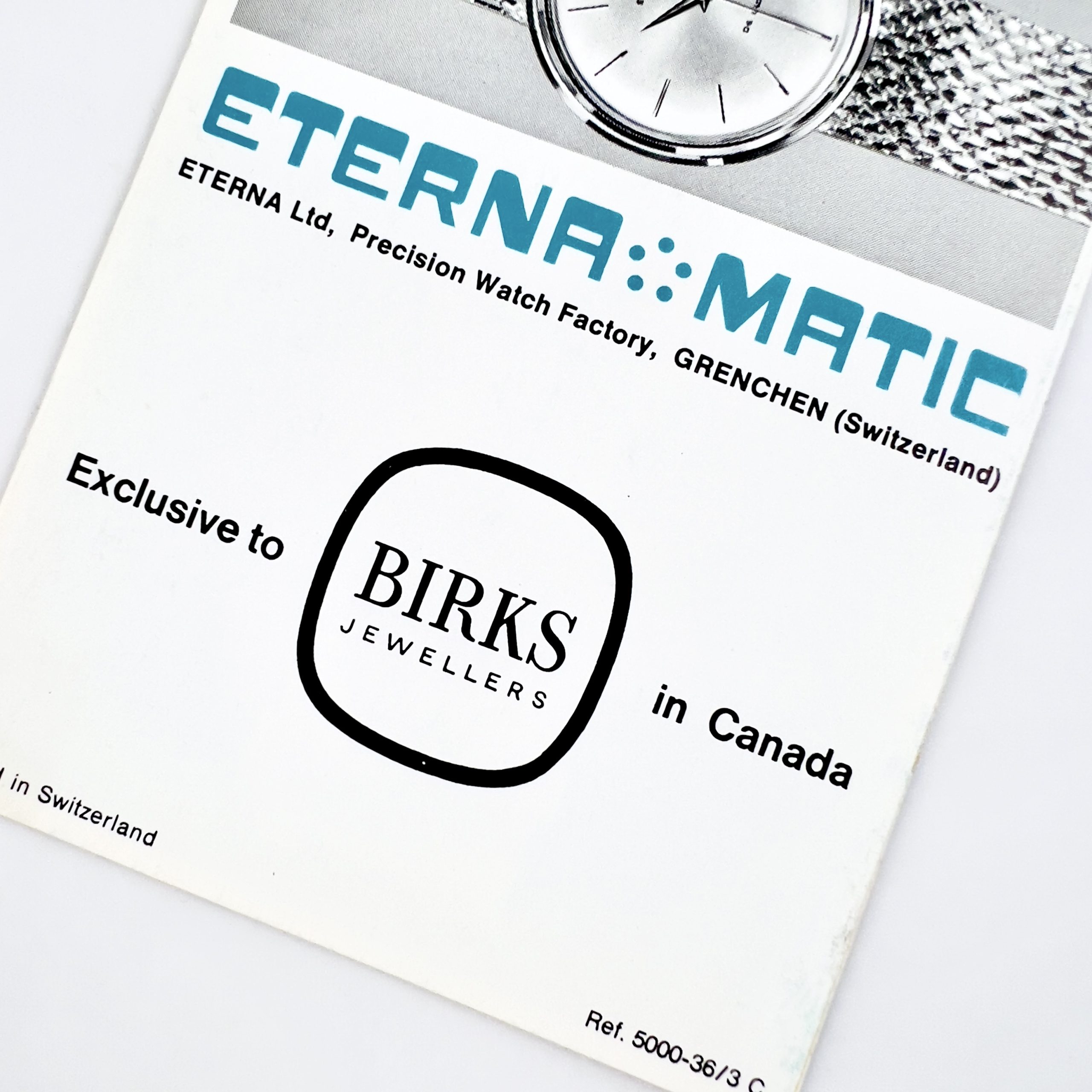 Présentation d’un très rare petit catalogue des montres Eterna-Matic, distribué vers 1962 par Birks, un des plus grands bijoutiers-horlogers du Canada.