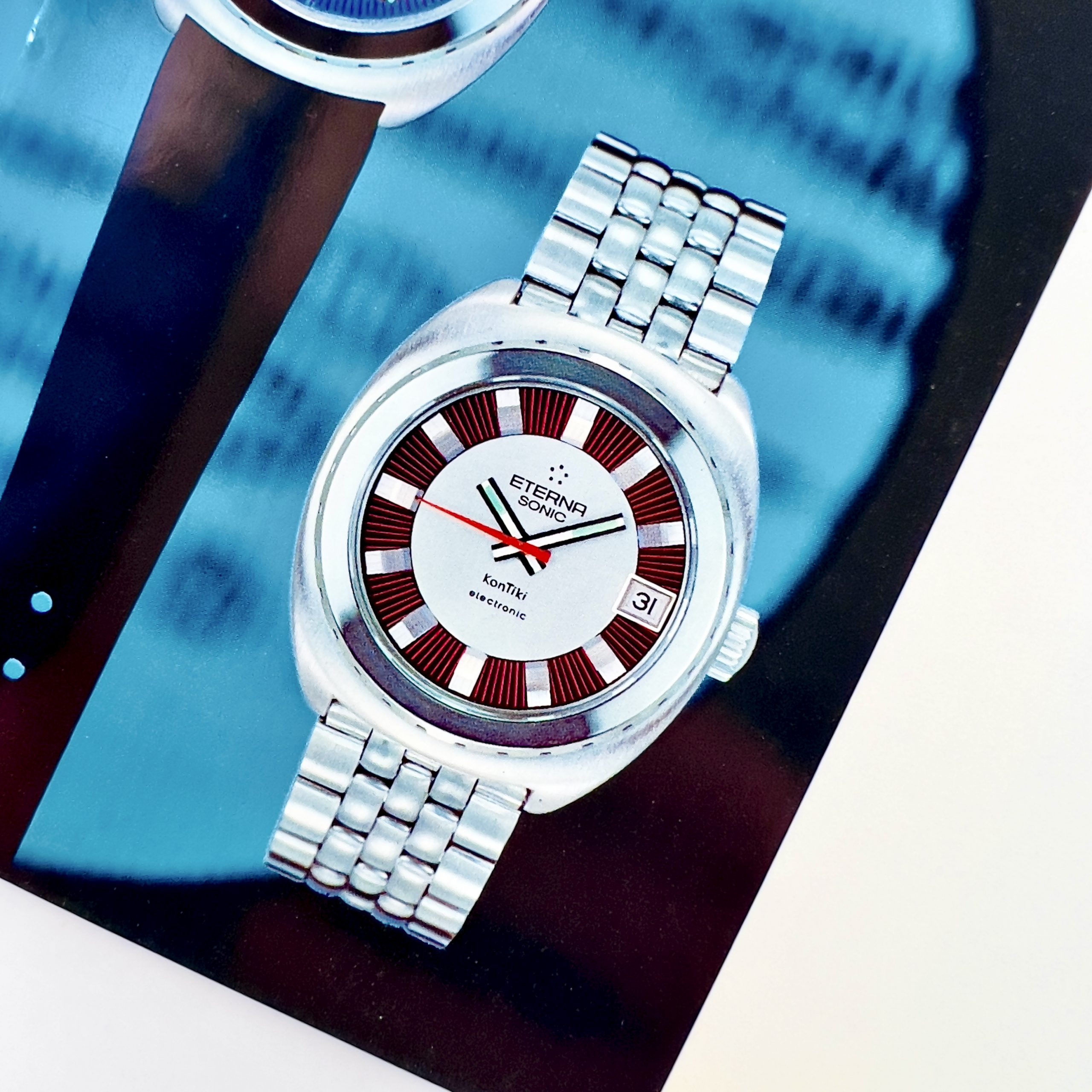 Présentation ici d’un rare exemplaire traitant spécifiquement de la série « Sonic » d’Eterna, dédiée aux modèles électroniques. Ce catalogue, destiné au marché Suisse et Français, est accompagné de son tarif pour l’année 1970. Il fait l’éloge de cette série de montre alimentée par le fameux mouvement à diapason, licence Bulova et Brevet Ebauches SA, appelé notamment Accutron chez Bulova et Unisonic chez Universal Genève.