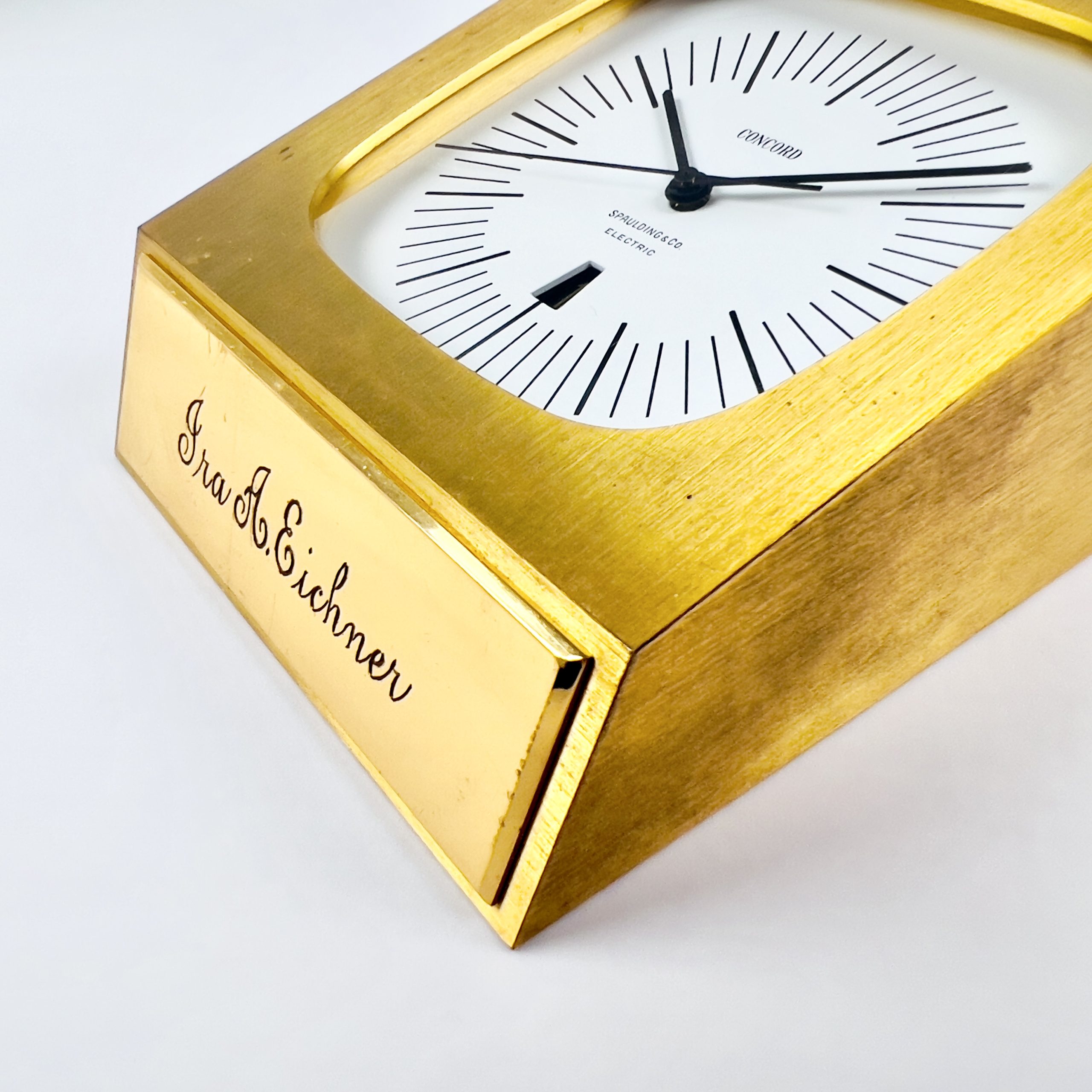 Cette horloge illustre la rencontre de deux traditions d’excellence : la rigueur technique suisse, incarnée par Concord, et l’élégance artisanale américaine, représentée par Spaulding & Co. Aujourd’hui, elle constitue une pièce de collection rare, symbole d’une époque où le design et l’artisanat se conjuguent pour créer des objets durables, beaux et porteurs de sens, témoignant de l’histoire et du prestige des deux maisons. Cette horloge arbore une plaque amovible et personnalisée au nom de Ira A. Eichner, probablement le fondateur de l’AAR Corp., qui fourni des radios et matériels radios depuis 70 ans aux Etats-Unis.