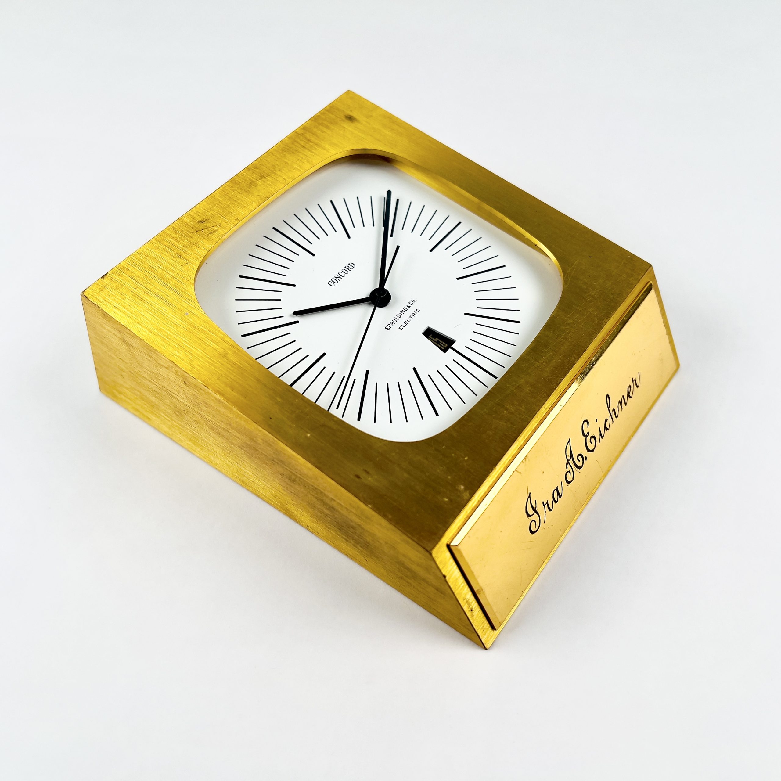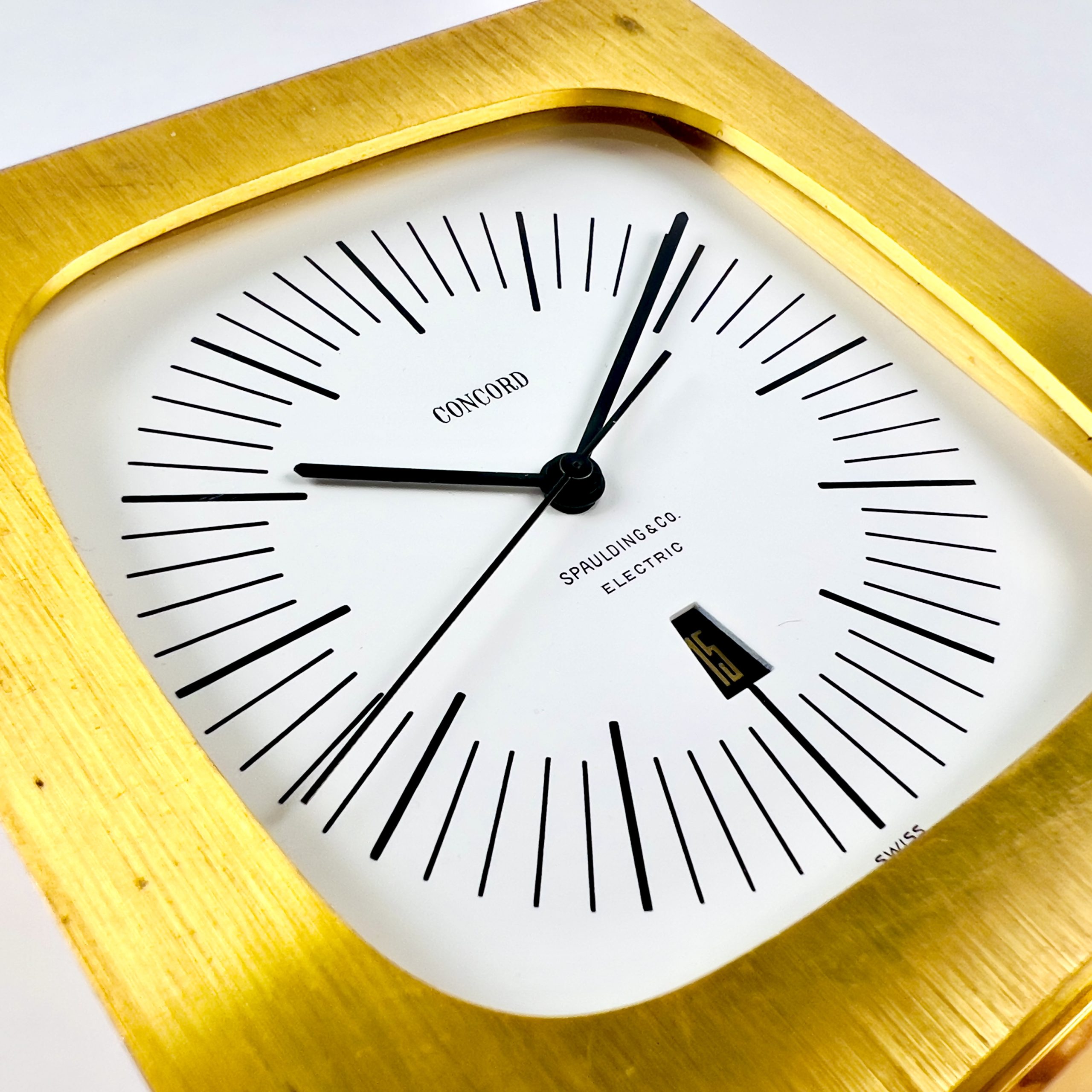 C’est dans ce contexte, au cœur des années 60/70, que Concord et Spaulding & Co unissent leurs talents pour créer une horloge d’exception. Concord y apporte sa maîtrise du mouvement, sa précision suisse et un design épuré typique de l’époque, tandis que Spaulding & Co enrichit la pièce par son sens du détail, le choix de matériaux nobles et un savoir-faire joaillier raffiné. Le résultat est une horloge à la fois fonctionnelle et décorative, intégrant les lignes géométriques modernes des années 60, des surfaces métalliques polies et des touches de luxe discrètes.