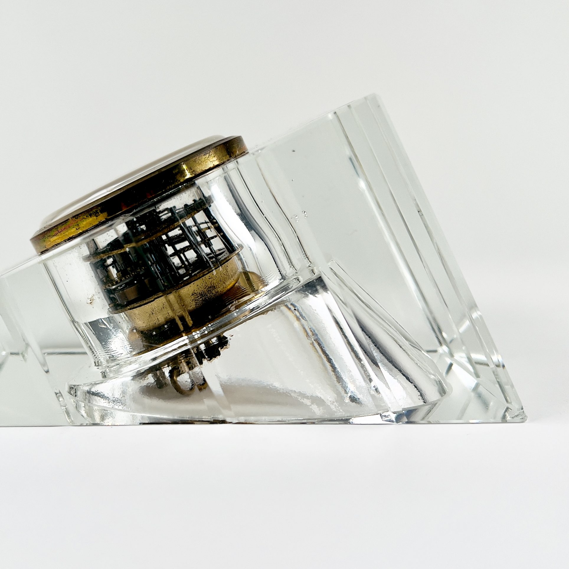 Le boîtier, en verre épais et sculpté, présente une légère inclinaison afin de faciliter la lecture. Le pavé de verre est en très bon état excepté un tout petit éclat à l’arrière au niveau de la base, mais rien qui n’enlève à la beauté générale. L’horloge à été fabriquée en Allemagne et est équipée d’un système d’alarme. Étant donné son poids d’un peu plus d’1 kg, elle peut facilement faire office de presse-papiers.