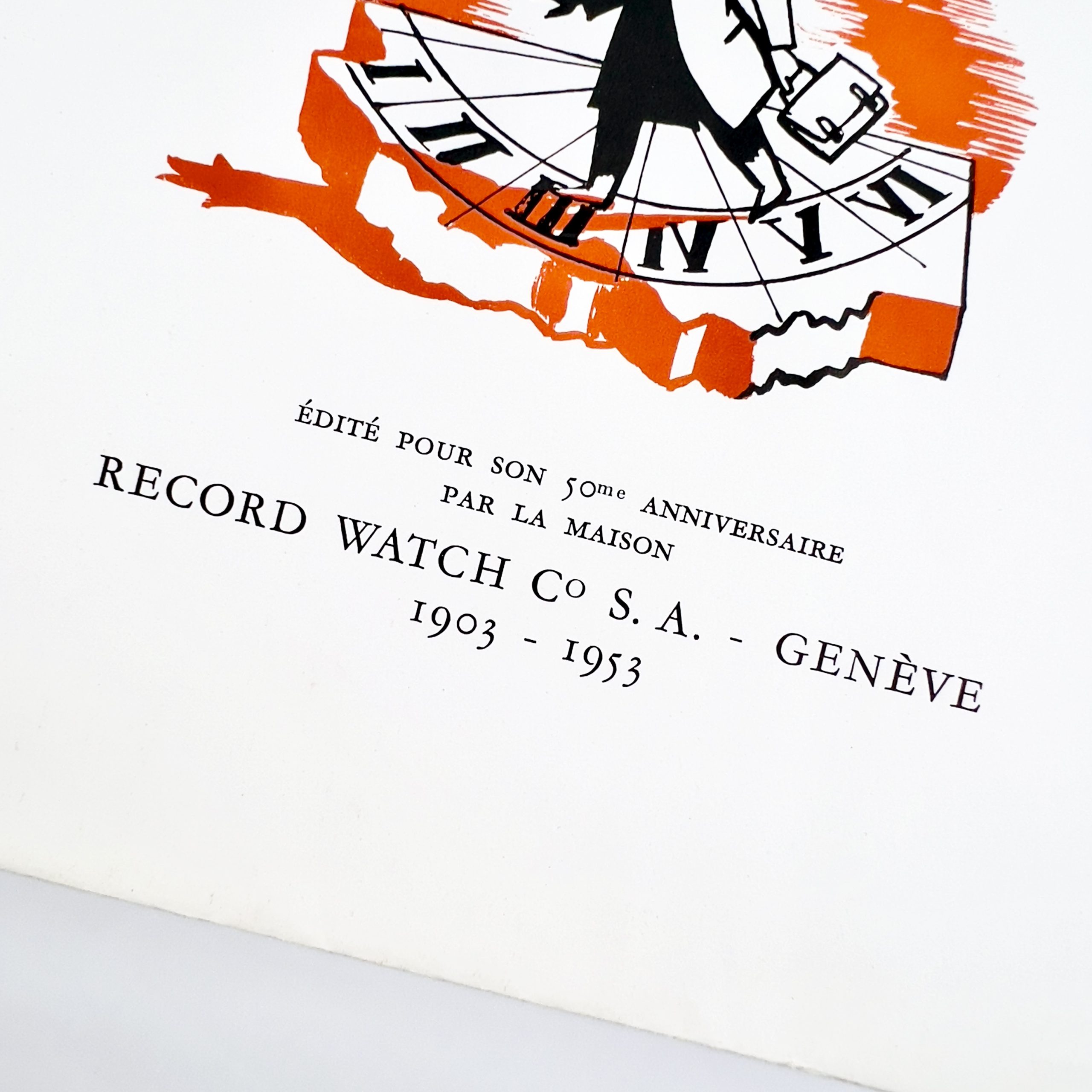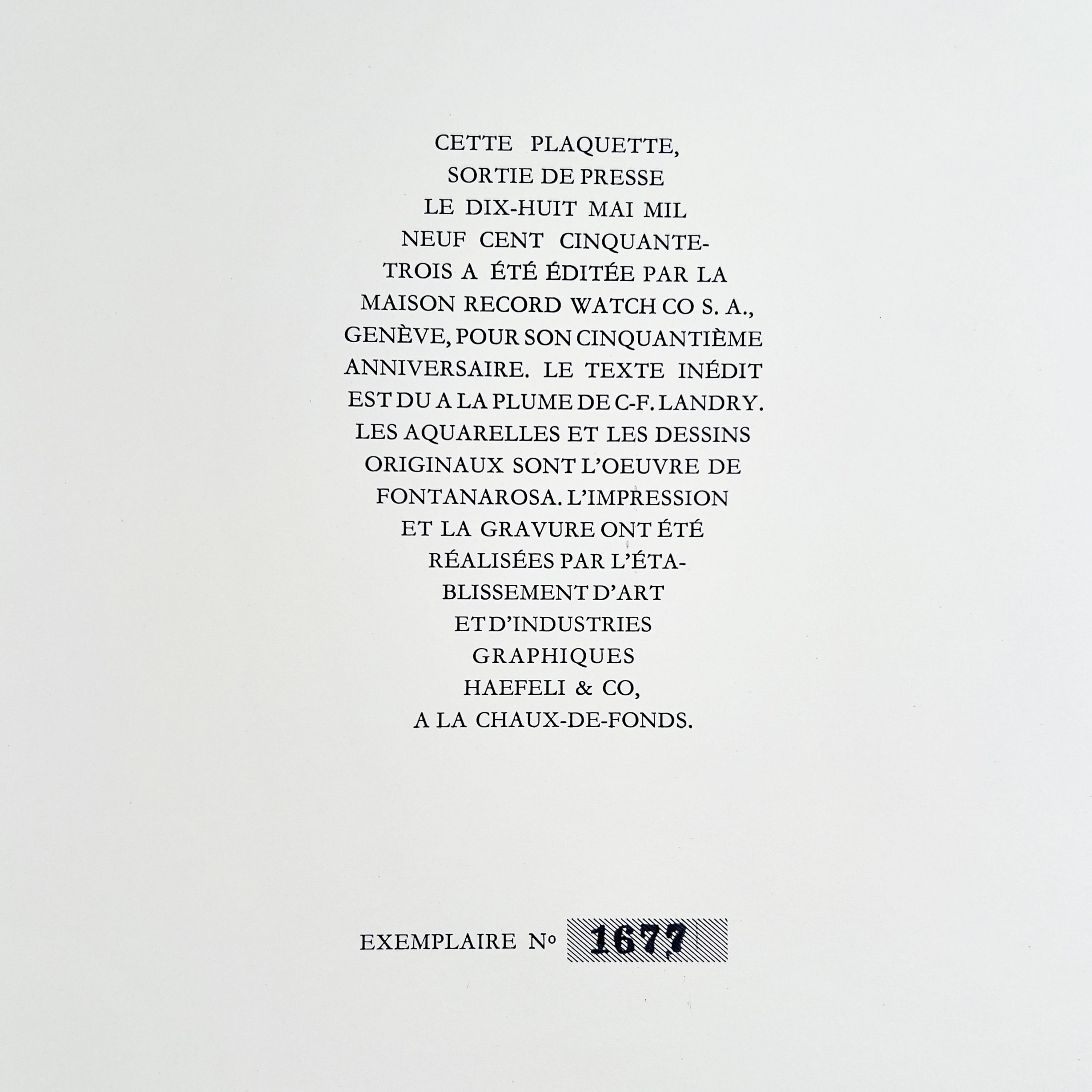 Cette plaquette, sortie de presse le dix-huit mai 1953 a été éditée par la maison record watch co Genève, pour son cinquantième anniversaire. le texte inédit est du a la plume de Charle-François Landry, écrivain et poète suisse, les aquarelles et les dessins originaux sont l’oeuvre de Fontanarosa.