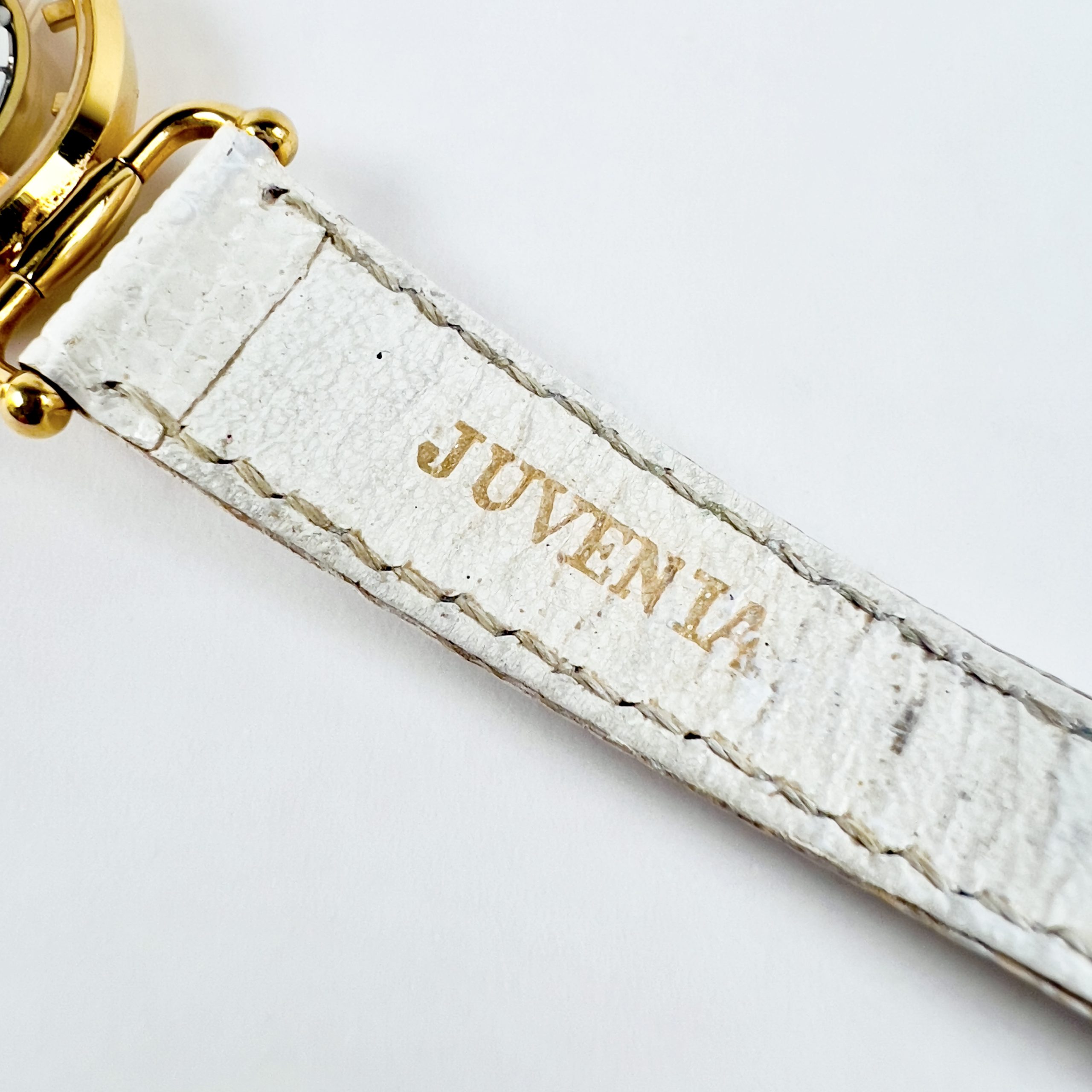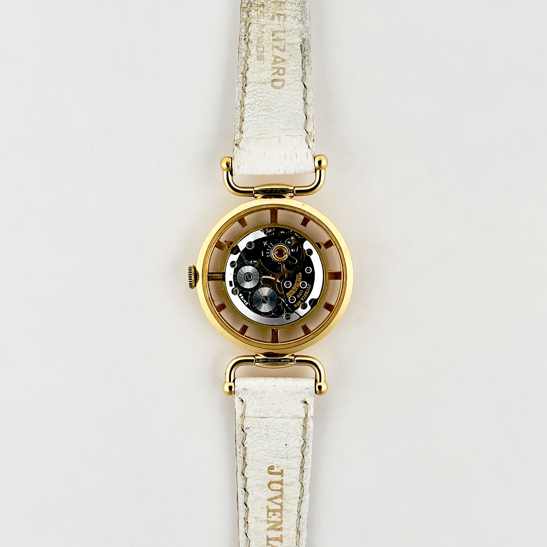 La montre est alimentée par un mouvement mécanique dit « squelette » de fabrication suisse Juvenia à 17 rubis. L’ensemble est dans un état quasi-parfait et complet d’origine, avec bracelet cuir blanc et boucle Juvenia d’origine.