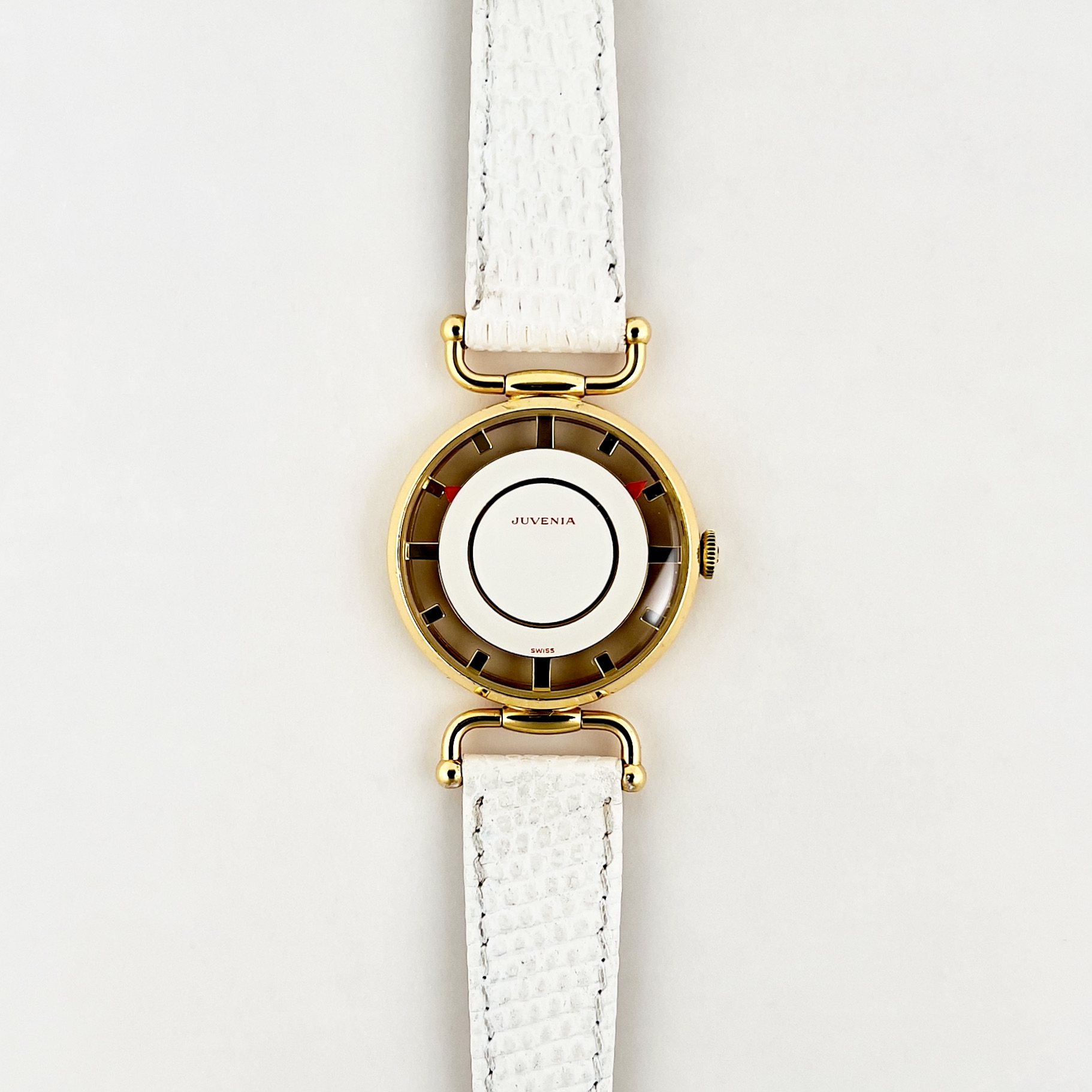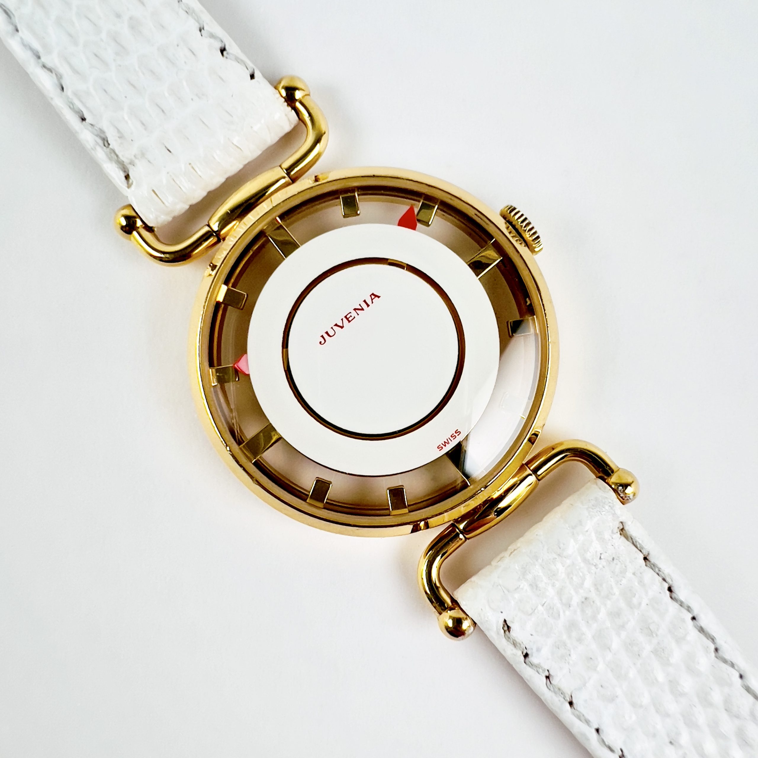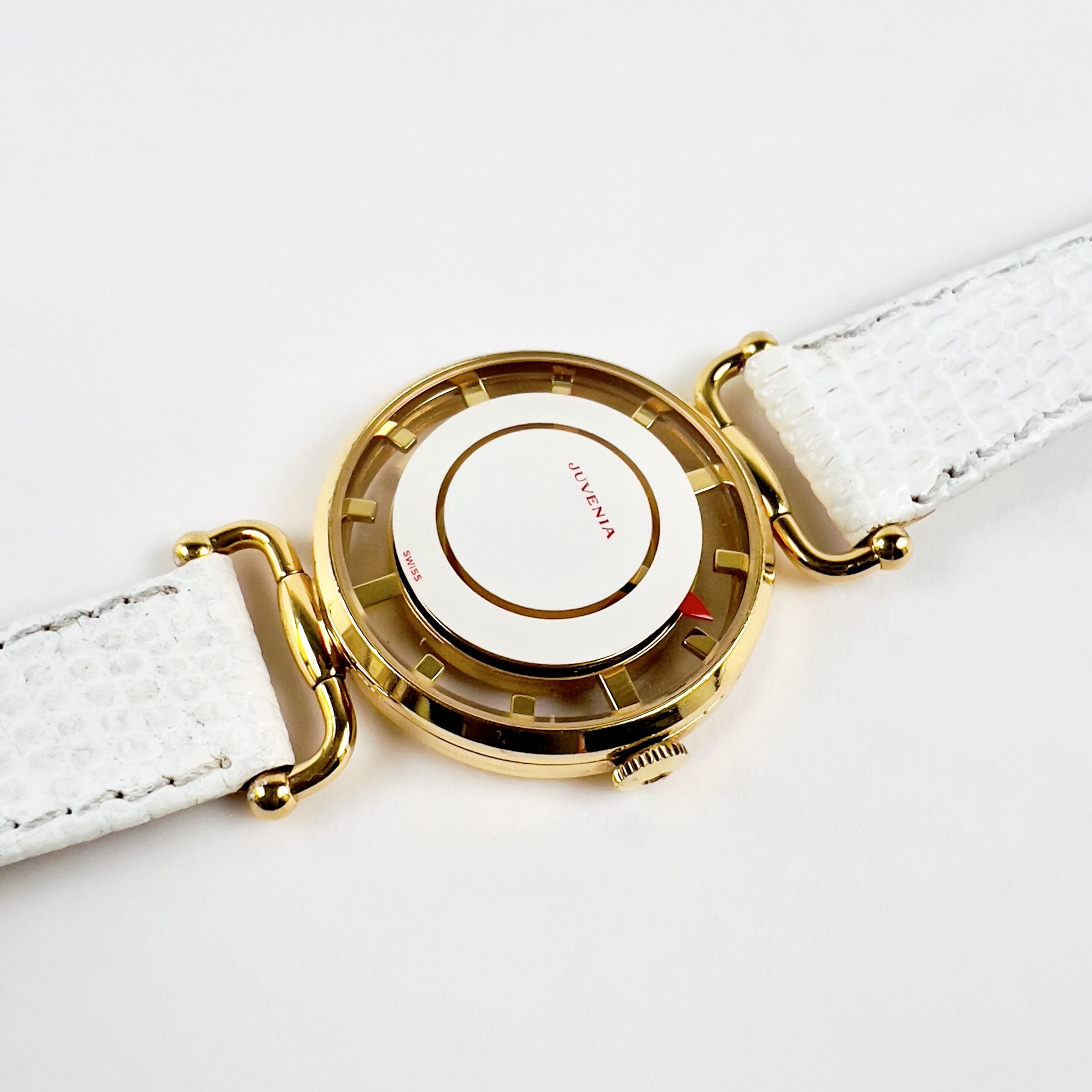 Cet exemplaire arbore le typique verre faisant aussi office de cadran dans sa finition blanc brillant et superbement contrasté avec ses aiguilles de couleur rouge. Le boitier présente encore les inscriptions Juvenia et l’indice de plaquage sur les flancs typique de cette série.
