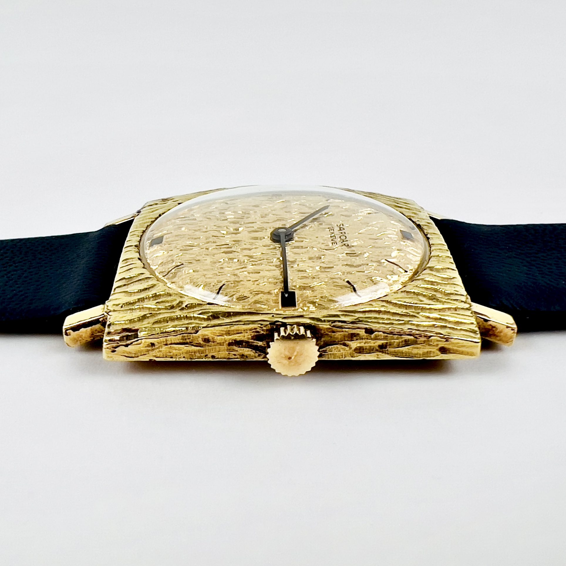Cet exemplaire arbore un cadran et un boitier avec une finition dite « écorce » . L’ensemble est dans un état correct pour son âge avec quelques imperfections de placages dues à l’âge. La montre est alimentée par un mouvement mécanique à remontage manuel de fabrication suisse. Un pièce peu courante, issue d’une petite série d’un petit fabricant parmi les grands.