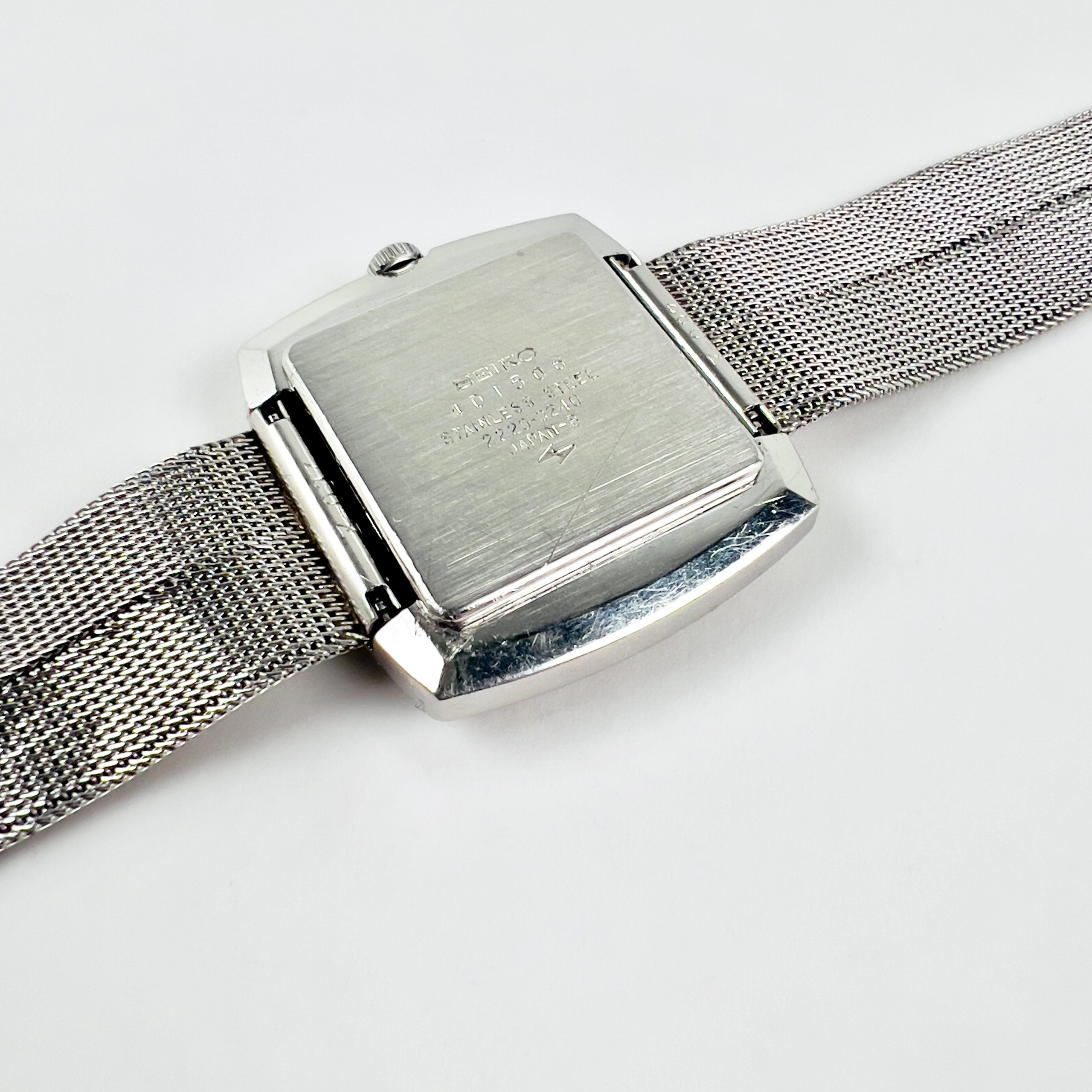 La référence 2220-3240 se distingue par un boîtier coussin entièrement réalisé en acier inoxydable, caractéristique du design horloger du début des années 1970. Sa géométrie repose sur un carré aux angles adoucis, dont les flancs légèrement galbés créent une silhouette à la fois douce et structurée. Cette architecture permet d’intégrer harmonieusement la lunette, le cadran et le verre dans un ensemble compact, où les surfaces polies et les lignes continues accentuent la perception de finesse au poignet.