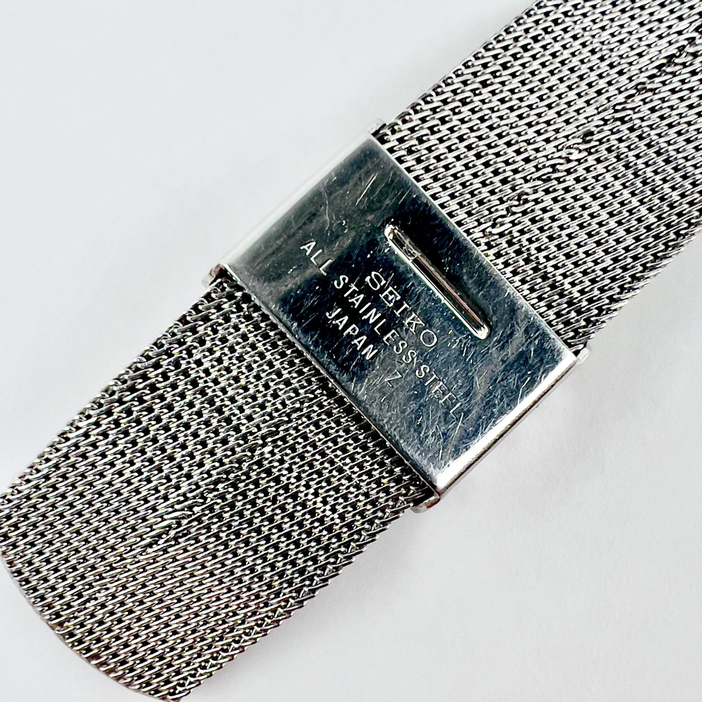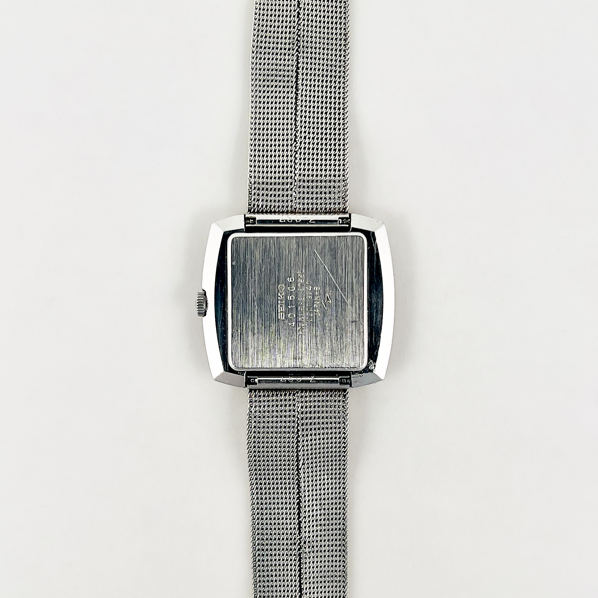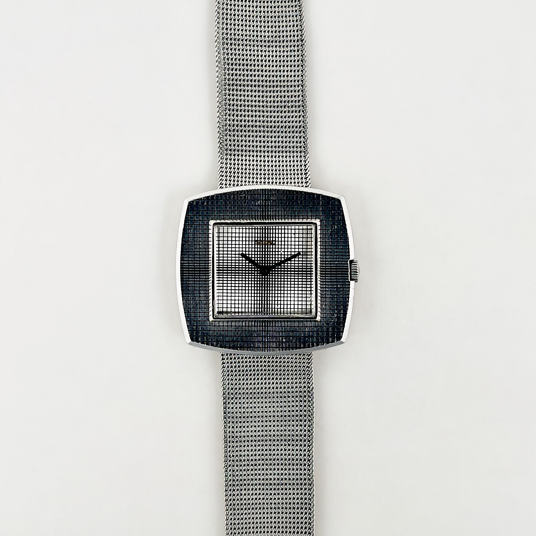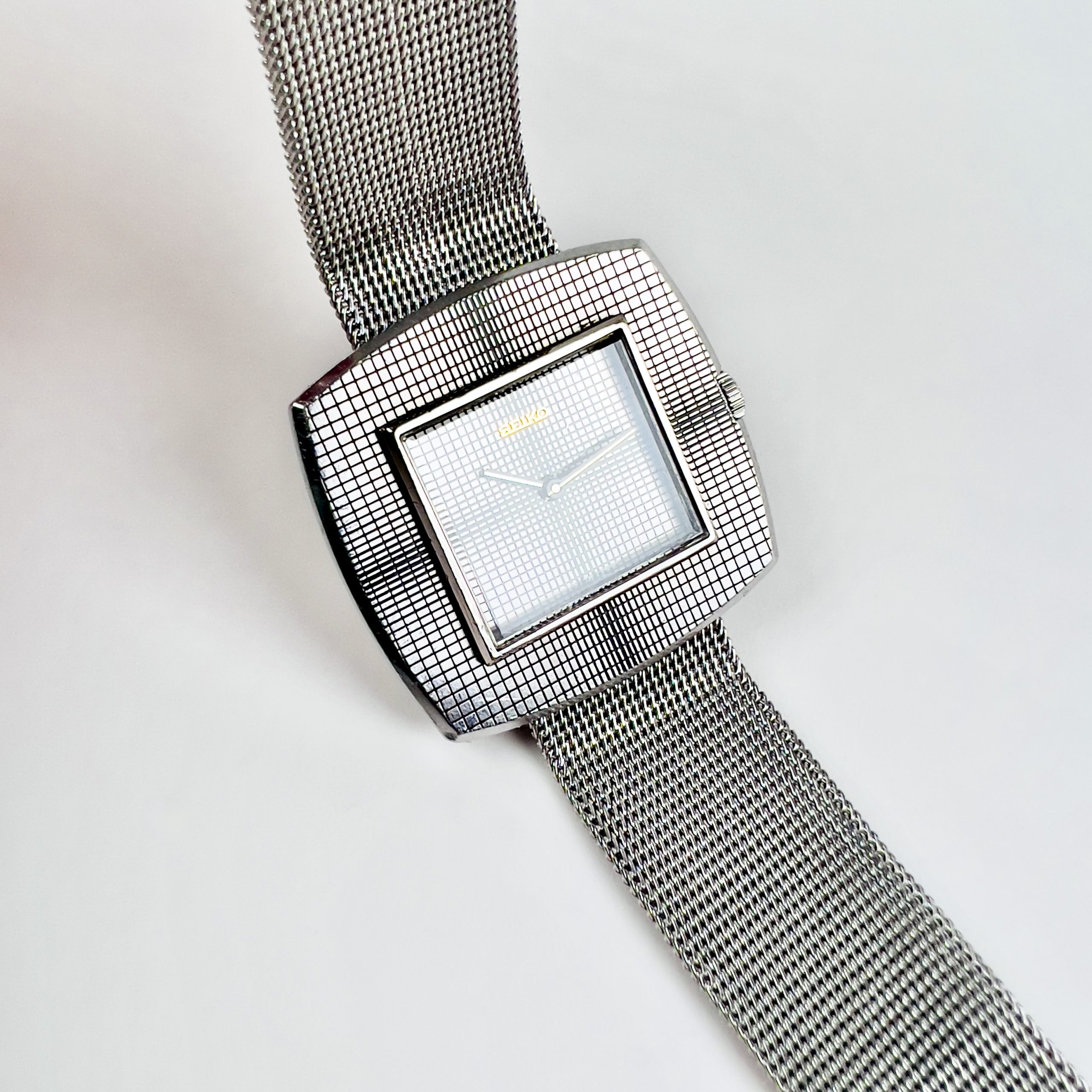Le cadran reprend et prolonge cette logique géométrique. Il présente une composition structurée autour d’un carré central légèrement encadré, créant une transition visuelle subtile avec la forme coussin du boîtier. La surface est animée par une texture quadrillée extrêmement fine, qui capte la lumière et confère au cadran une profondeur discrète. Cette micro-texture, fréquente dans le design Seiko des années 1970, apporte un relief visuel tout en conservant une grande sobriété. L’affichage est volontairement épuré : deux aiguilles seulement, sans trotteuse, renforçant la pureté graphique de l’ensemble et le caractère habillé du modèle. L’ensemble est protégé par un verre Hardlex, verre minéral renforcé développé par Seiko, qui est ici neuf et d’origine.