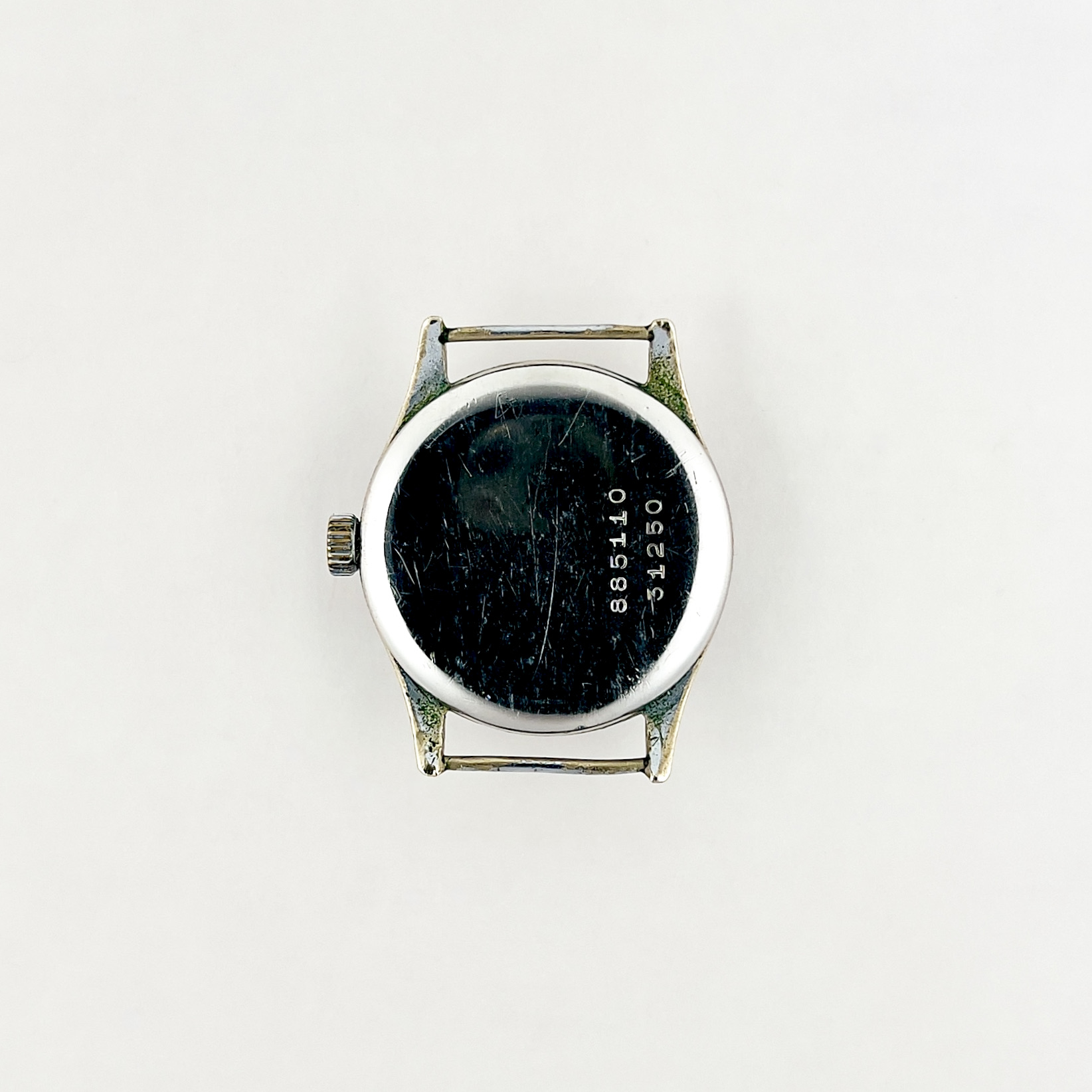 Techniquement, la montre se compose d’un boîtier en acier chromé de 30 mm, avec attaches fixes, conçu pour résister aux conditions de terrain. Le cadran noir est orné de chiffres arabes peints et d’aiguilles lumineuses, assurant une excellente lisibilité. Elle est animée par un mouvement mécanique à remontage manuel — le calibre Universal Genève 262, réputé pour sa fiabilité.
