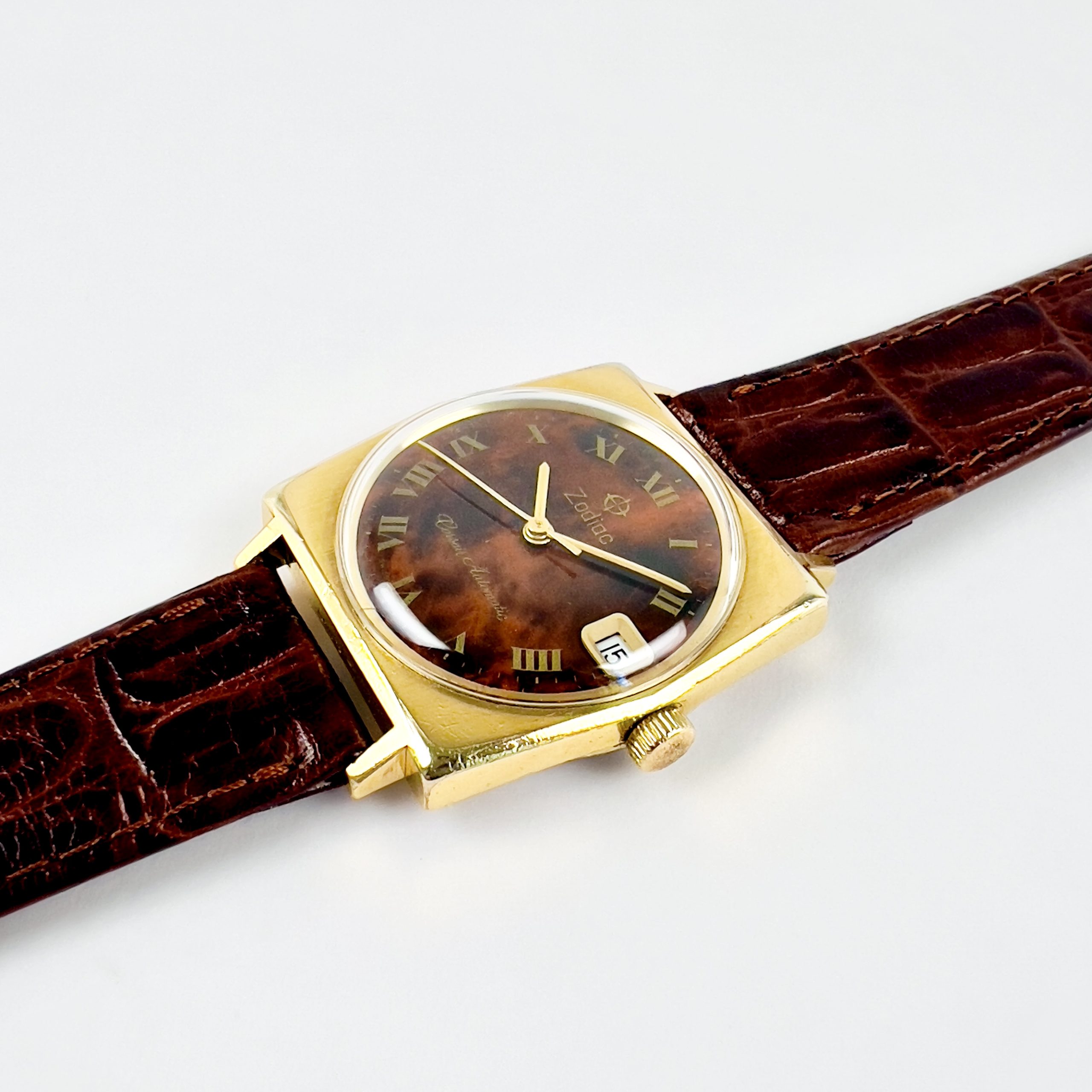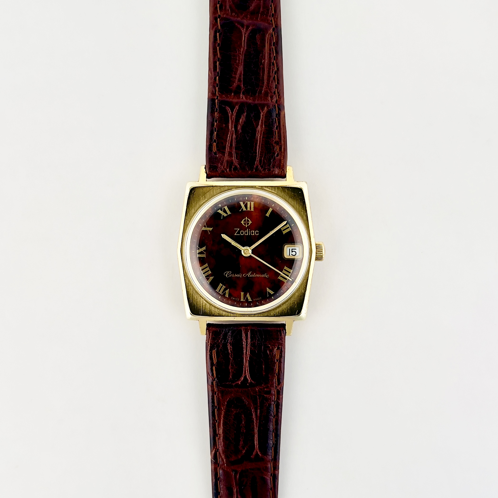 Présentation ici d’une superbe montre Zodiac Corsair Automatic, dans sa version plaquée or avec date et cadran marbré rouge, s’inscrivant dans la production de la marque Zodiac de la fin des années 1960, une période marquée par une forte créativité dans le design horloger.