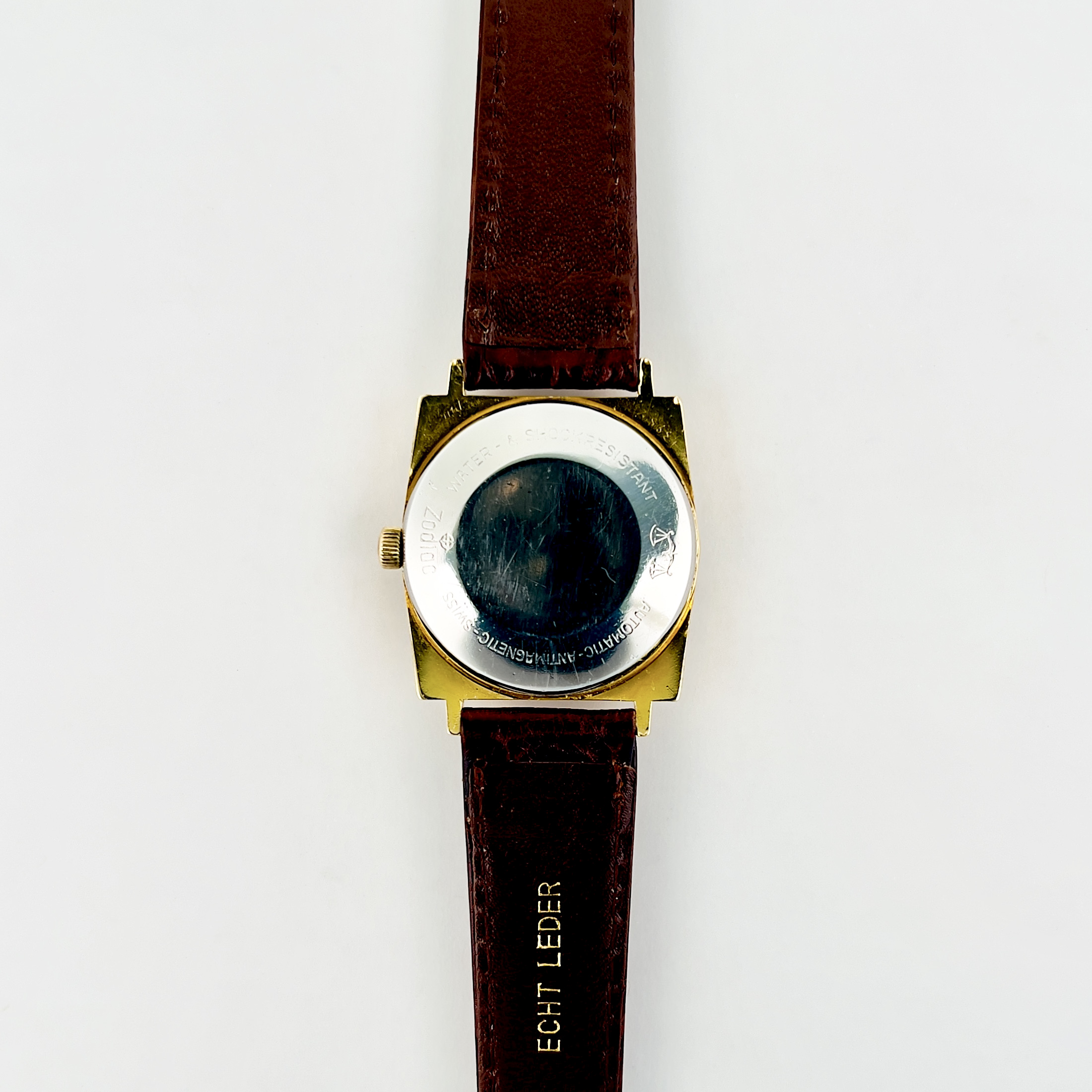 Notre premier souci fut de mettre au point, d’entente avec plusieurs de nos collègues fabricants, un calibre automatique suffisamment plat pour permettre un habillage élégant et fonctionnellement parfait. Partant de ce calibre, nous avons créé et nous continuons d’étudier des modèles qui, tout en ayant une ouverture ronde, contrastent par leurs lignes avec les montres classiques. Une illustration de cette recherche est donnée par notre modèle « Corsair»: montre en forme de losange avec ouverture ronde et cadran de caractère.