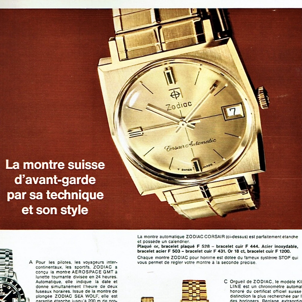 Une des raisons essentielles de notre développement actuel réside dans l’effort que nous faisons dans le domaine de la recherche esthétique: Zodiac s’est acquis une place de choix sur le marché de la montre avec ses modèles spéciaux « Glorious », «Olympos », « Corsair», et « Sea Wolf». Sur le plan de la recherche, nous avons d’ailleurs également suivi une politique particulière en nous consacrant depuis plus de 20 ans à la mise au point de modèles automatiques et étanches pour hommes. Dès le début, nous avions admis pour principe — les faits nous ont donné raison – que la montre automatique était la deuxième montre qu’un client achetait. Ceci découlant de l’évolution du goût et du standard de vie.