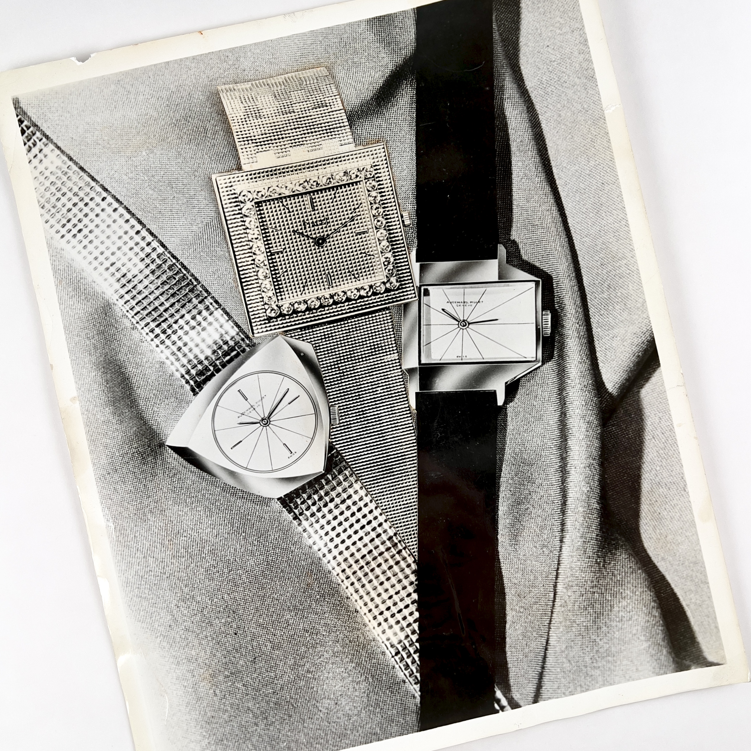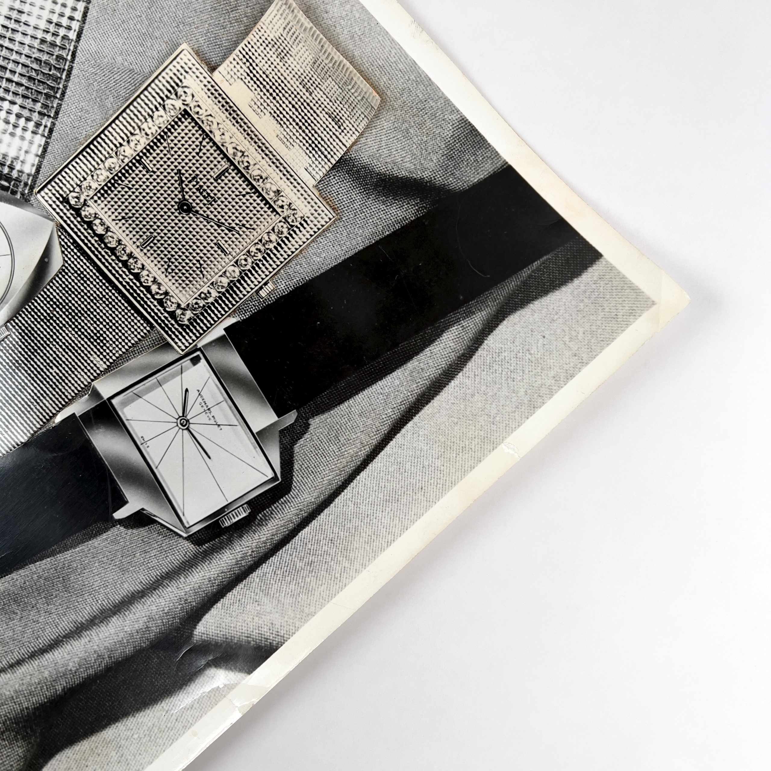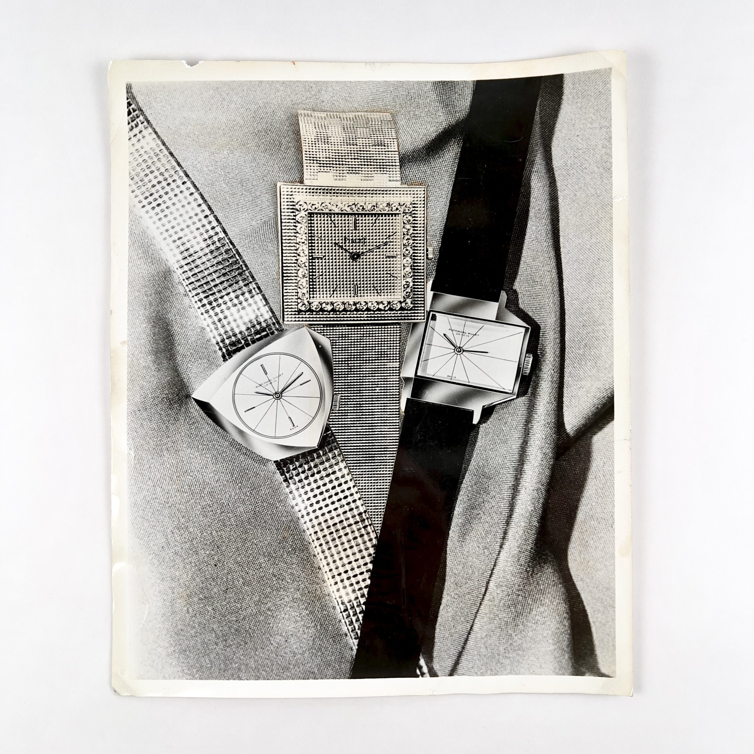 Cette photo a été prise lors du salon international de la montre et de la joaillerie de Genève de 1960. Le modèle Piaget a été découpée pour être intégrée sur la photo entre mes 2 modèles d’Audemars Piguet, afin d’en faire la photo finale pour un article de presse à venir. La photo est dans un état d’usage avec quelques déchirures sur les bords mais présente bien dans l’ensemble et mérite d’être encadrée comme il se doit pour une pièce historique.