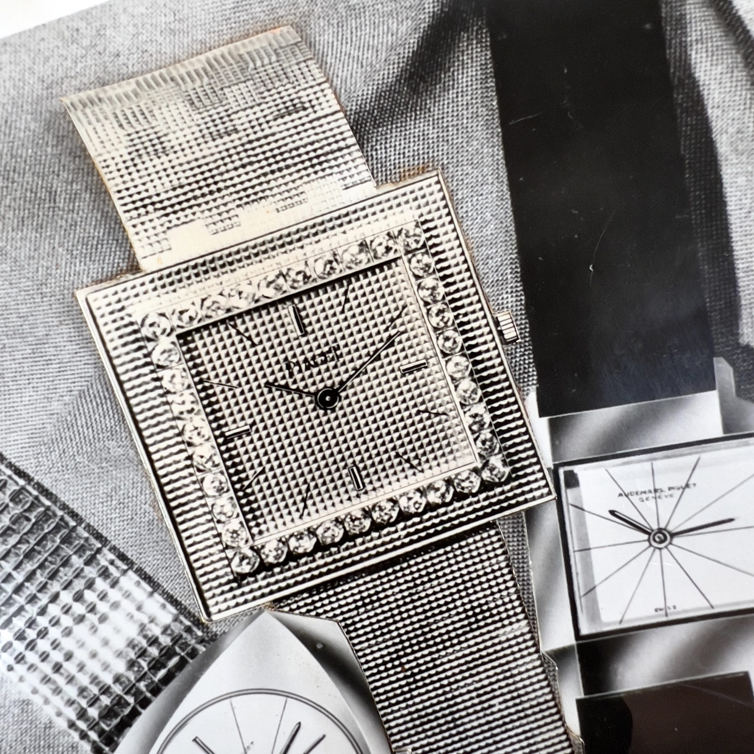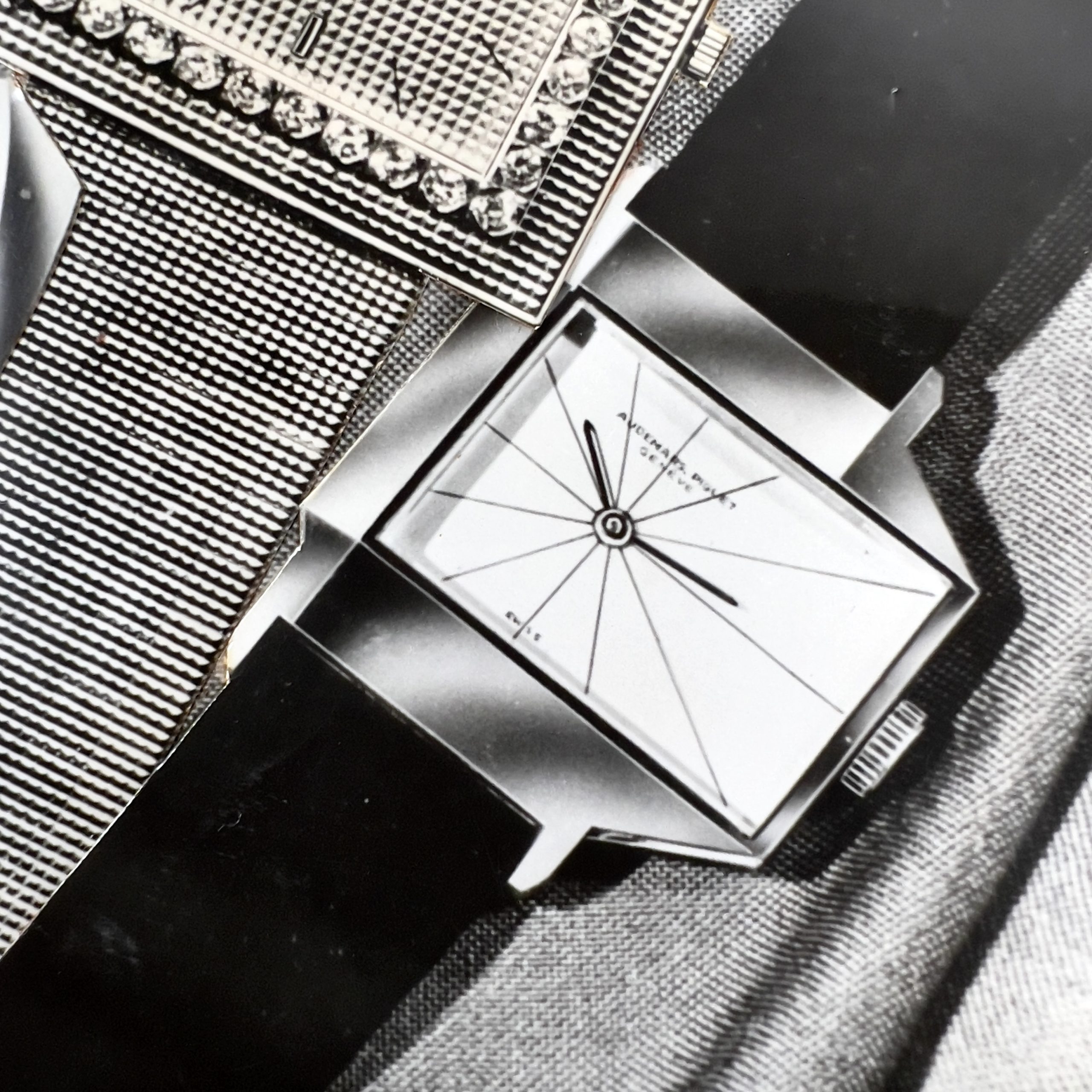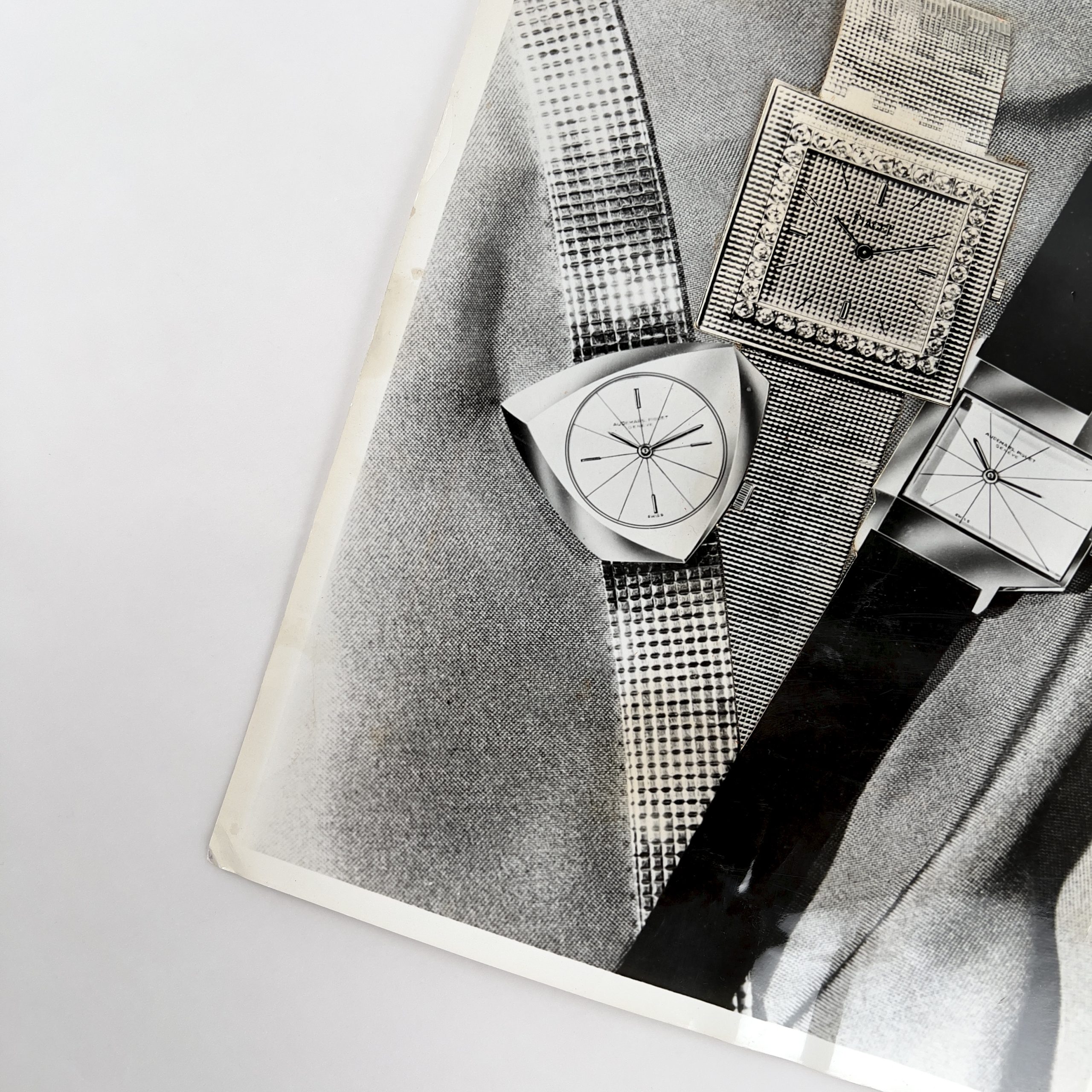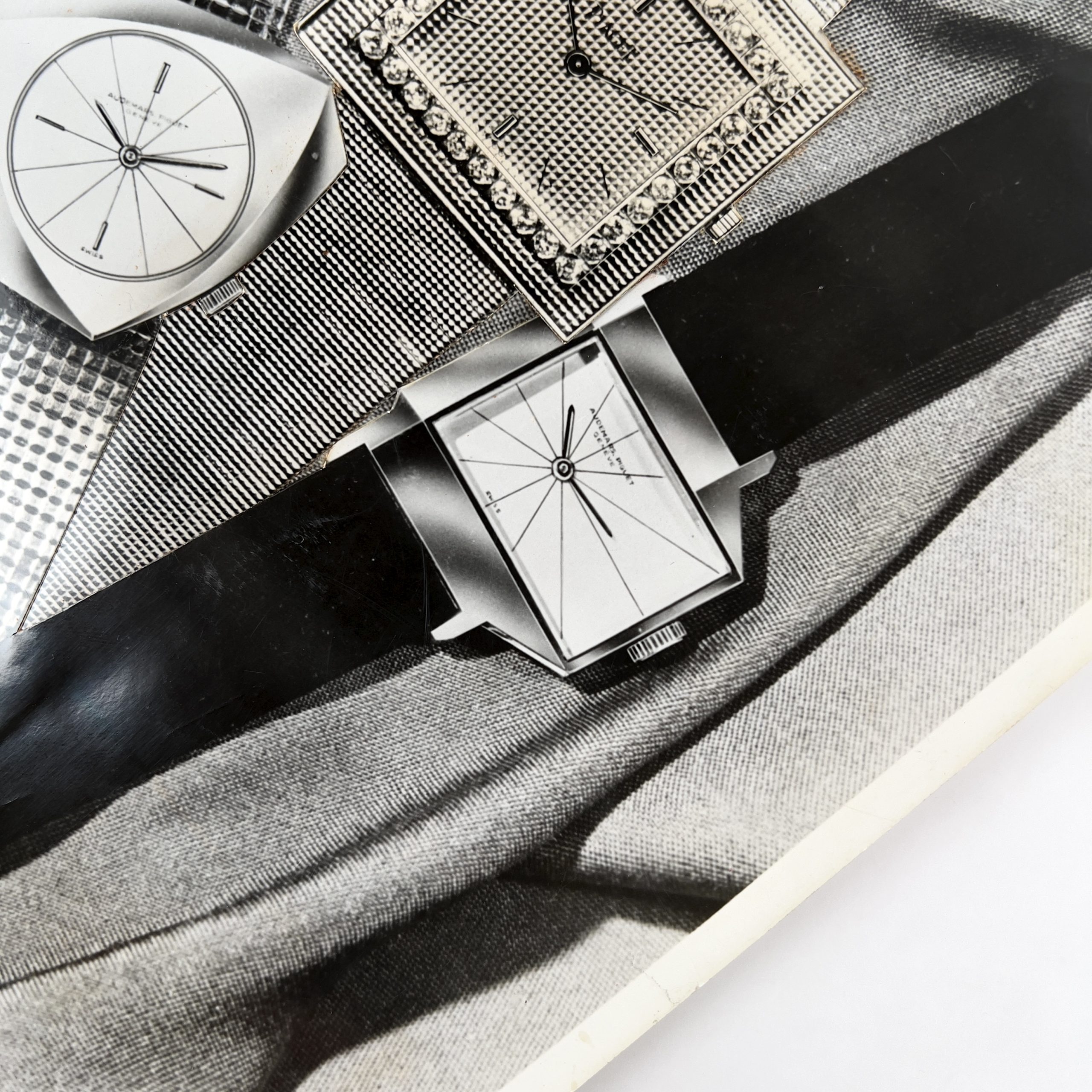 Cette photo a été prise lors du salon international de la montre et de la joaillerie de Genève de 1960. Le modèle Piaget a été découpée pour être intégrée sur la photo entre mes 2 modèles d’Audemars Piguet, afin d’en faire la photo finale pour un article de presse à venir. La photo est dans un état d’usage avec quelques déchirures sur les bords mais présente bien dans l’ensemble et mérite d’être encadrée comme il se doit pour une pièce historique.