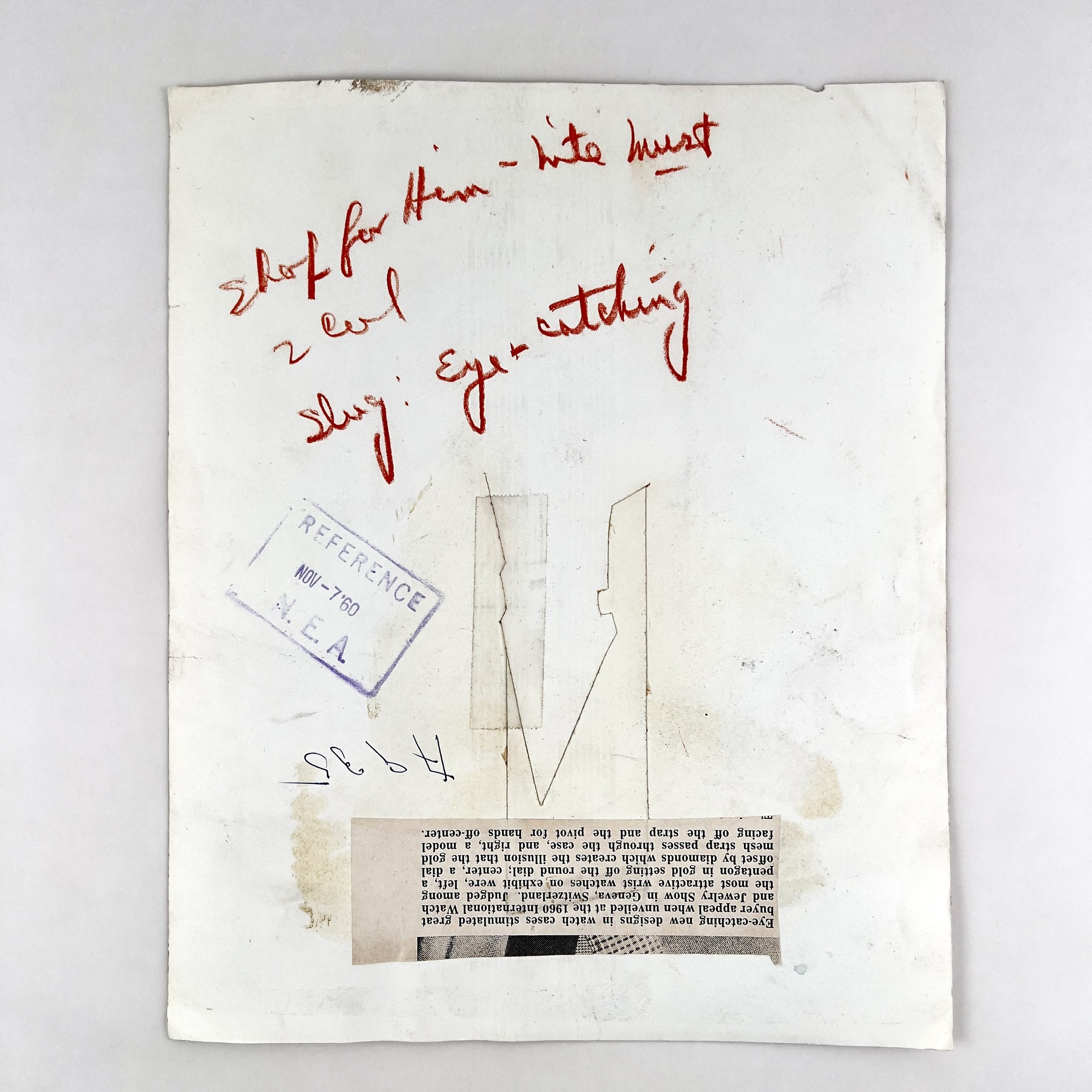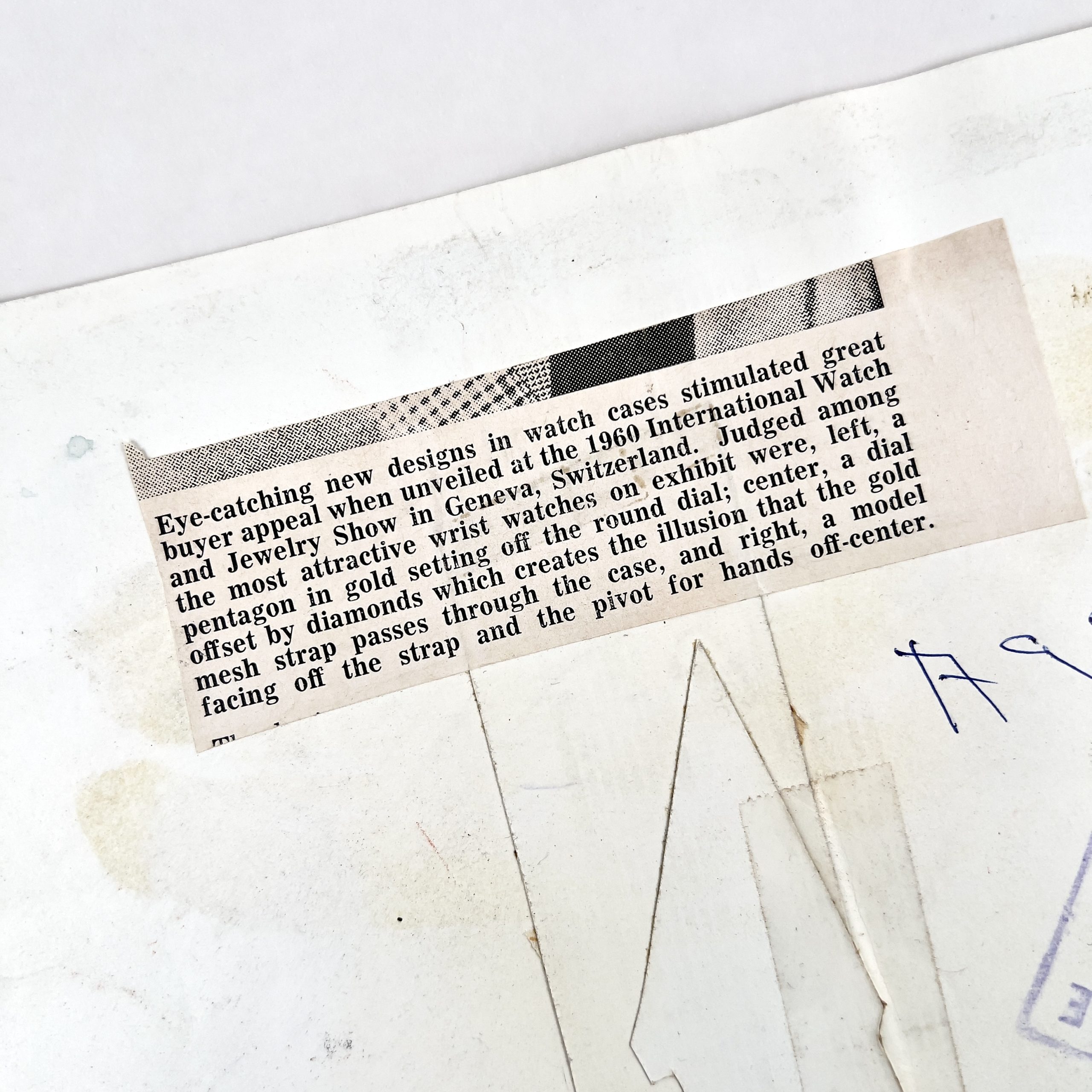 En voici la légende au verso: « Eye-catching new designs in watch cases stimulated great buyer appeal when unveiled at the 1960 International Watch and Jewelry Show in Geneva, Switzerland. Judged among the most attractive wrist watches on exhibit were, left, a pentagon in gold setting off the round dial; center, a dial offset by diamonds which creates the illusion that the gold mesh strap passes through the case, and right, a model facing off the strap and the pivot for hands off-center ».